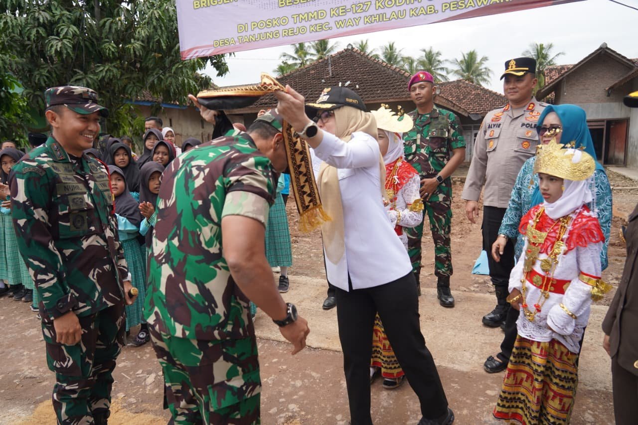 Pesawaran – Bupati Pesawaran Hj. Nanda Indira Bastian, S.E., M.M. menyambut Waaster Panglima TNI, Brigjen TNI (Mar) Bambang Hadi Suseno, dalam rangka pengawasan dan evaluasi (Wasev) TMMD ke-127 Kodim 0421/LS di Desa Tanjung Rejo, Kecamatan Way Khilau, Kabupaten Pesawaran.