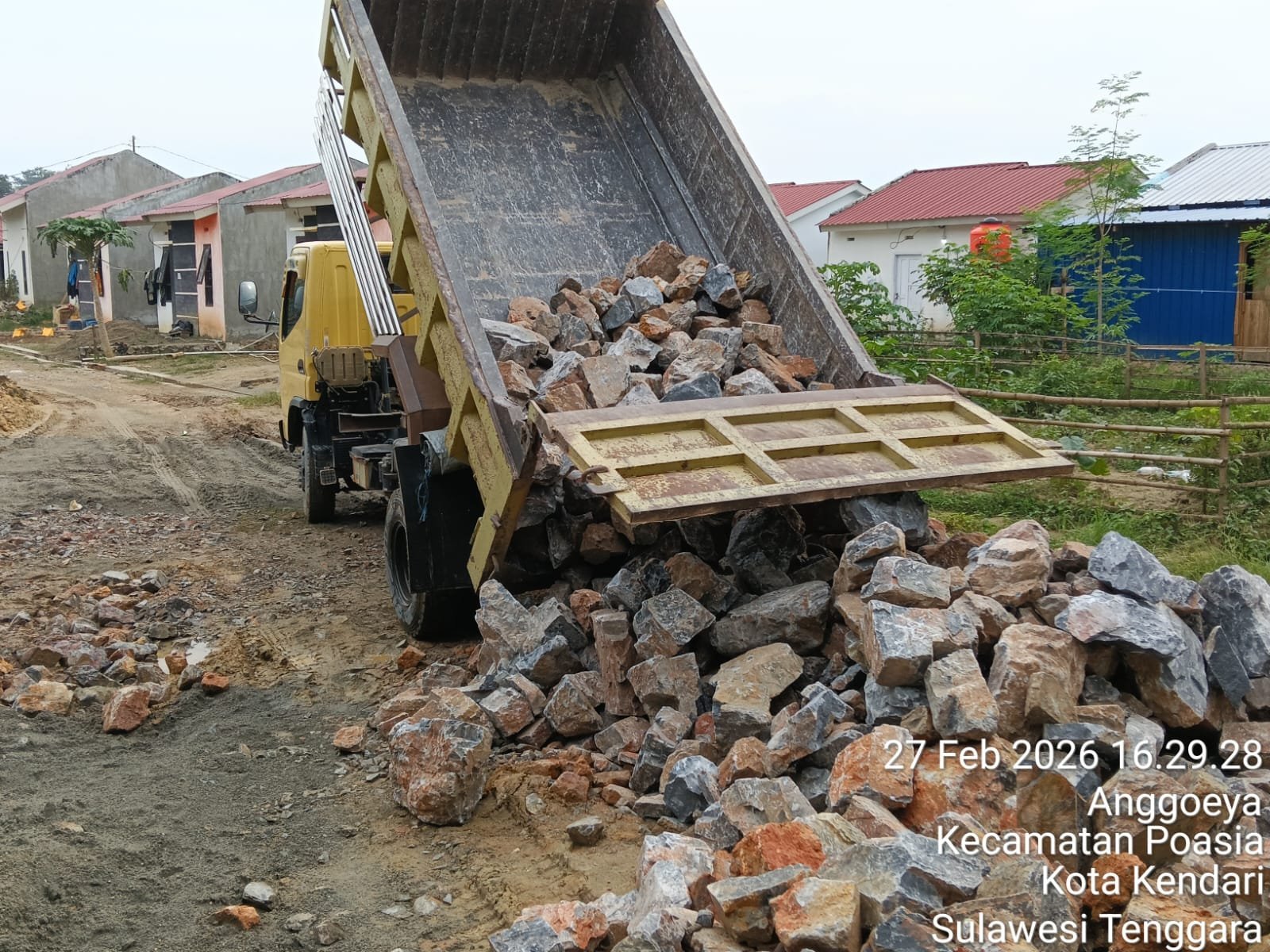 Semangat kerja para pengemudi truk dan tim lapangan mencerminkan dedikasi tinggi dalam mendukung pembangunan infrastruktur desa.