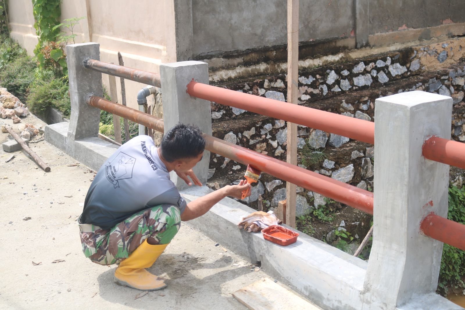 Personel Satgas bersama masyarakat melakukan pengecatan pada pagar pembatas jembatan sebagai bagian dari tahap finishing pembangunan.