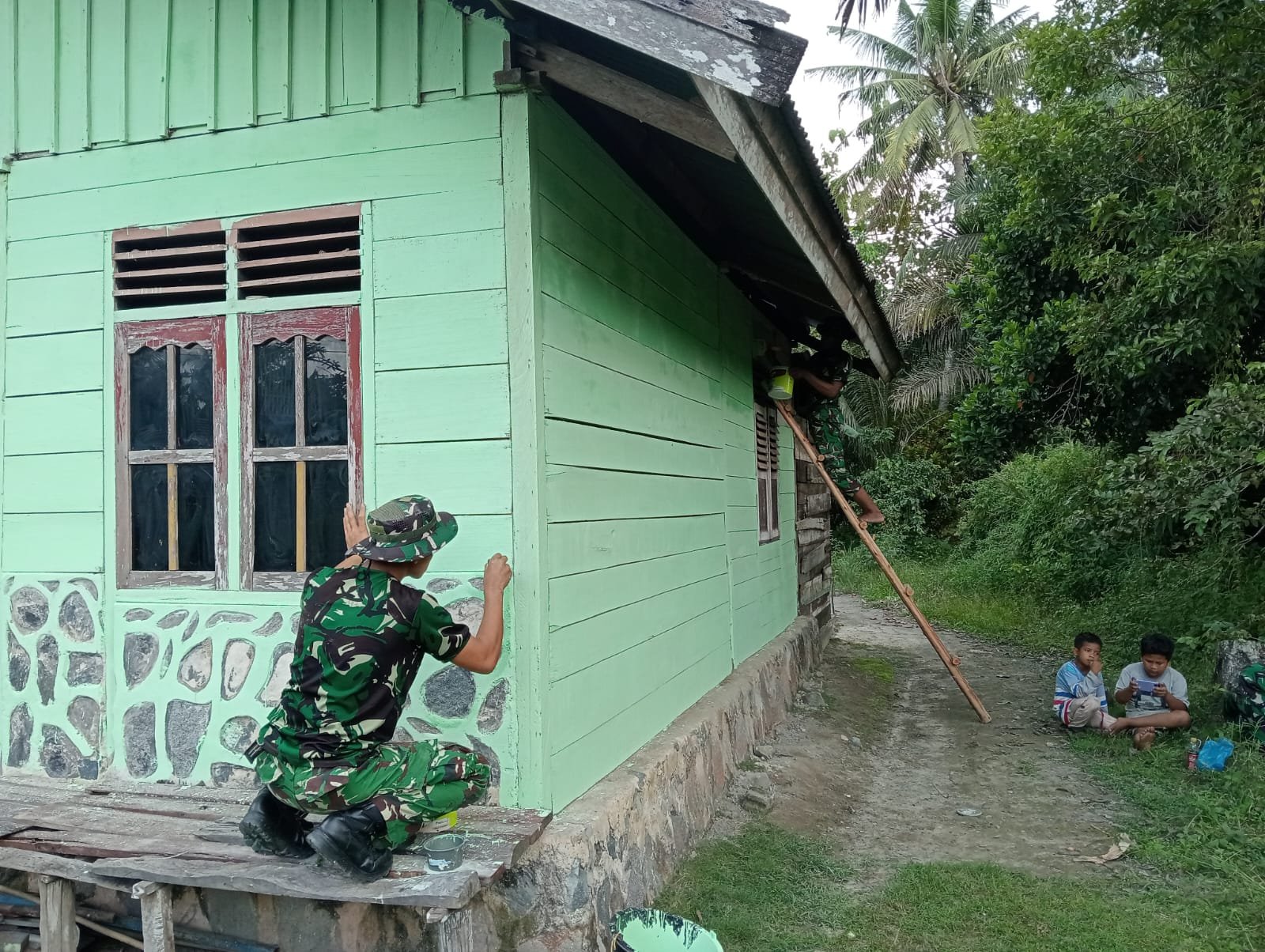 Anggota Satgas TMMD terlihat bekerja sama dengan masyarakat setempat, memastikan setiap bagian dinding mendapat perlakuan yang teliti agar hasil plester kuat dan tahan lama. Kolaborasi ini mencerminkan semangat gotong royong dalam program pembangunan yang tengah berlangsung.