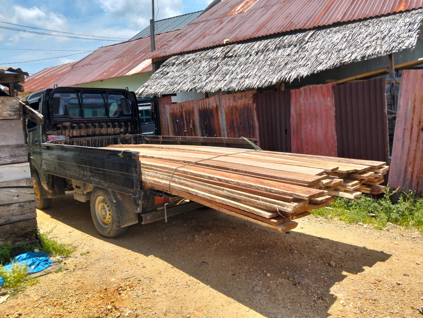 Material berupa batako sebagai bahan utama dinding serta papan kayu berkualitas untuk rangka bangunan dan bagian interior rumah telah tiba di lokasi pembangunan.