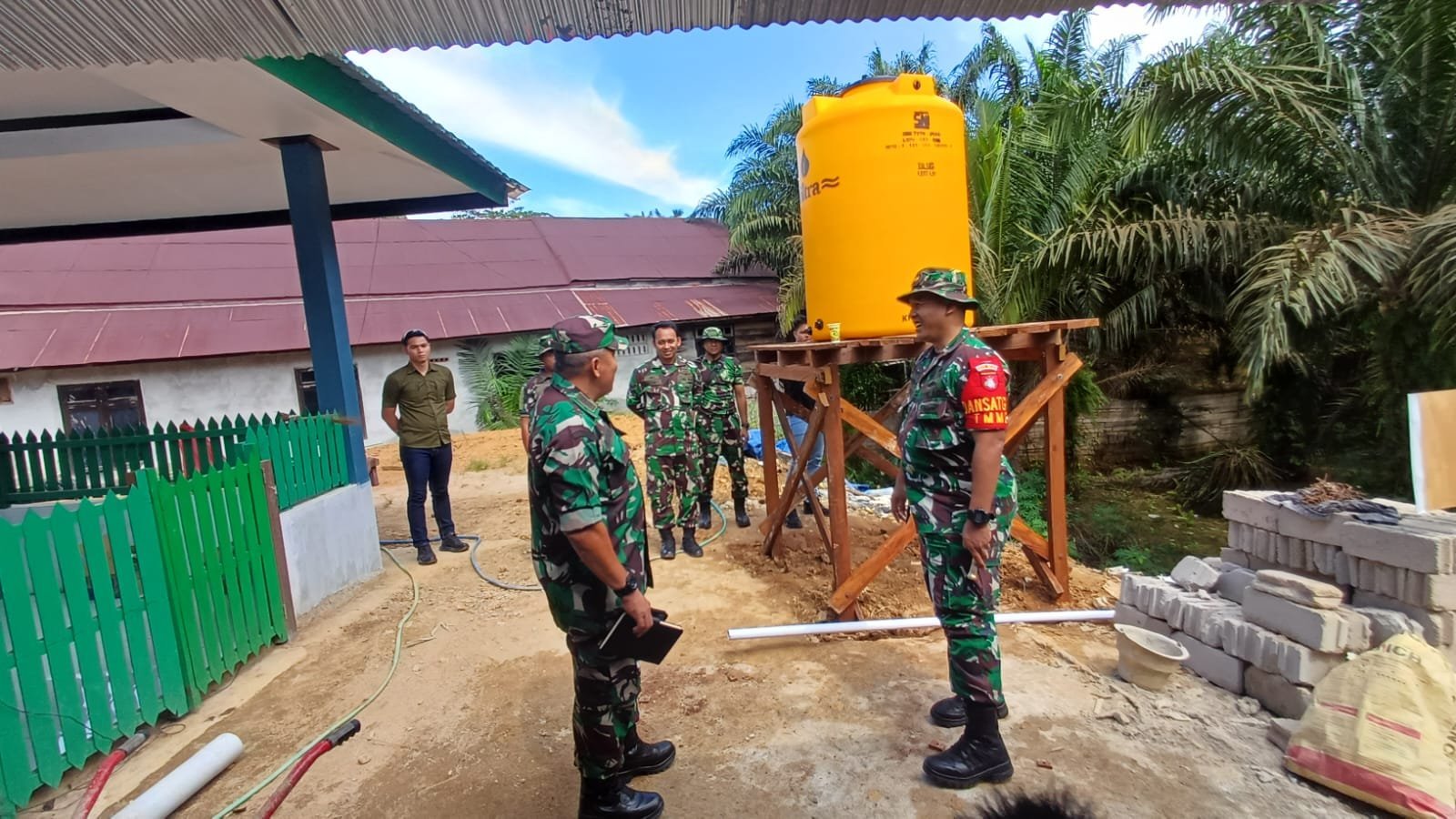 Kegiatan lembur ini dilakukan guna mempercepat penyediaan sarana penampungan air bersih bagi warga sekitar. Personel Satgas terlihat kompak menyiapkan dudukan dan memastikan posisi tandon terpasang dengan kokoh serta aman digunakan.