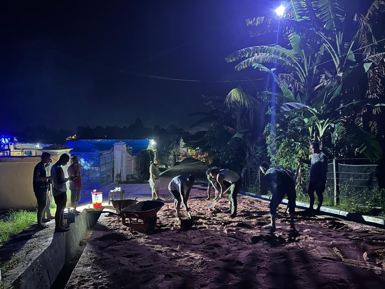 Dengan penerangan lampu seadanya, anggota Satgas bekerja penuh konsentrasi. Setiap ayunan sekop dan perataan pasir dilakukan secara teliti agar hasil akhir memiliki kualitas yang maksimal dan tahan lama.