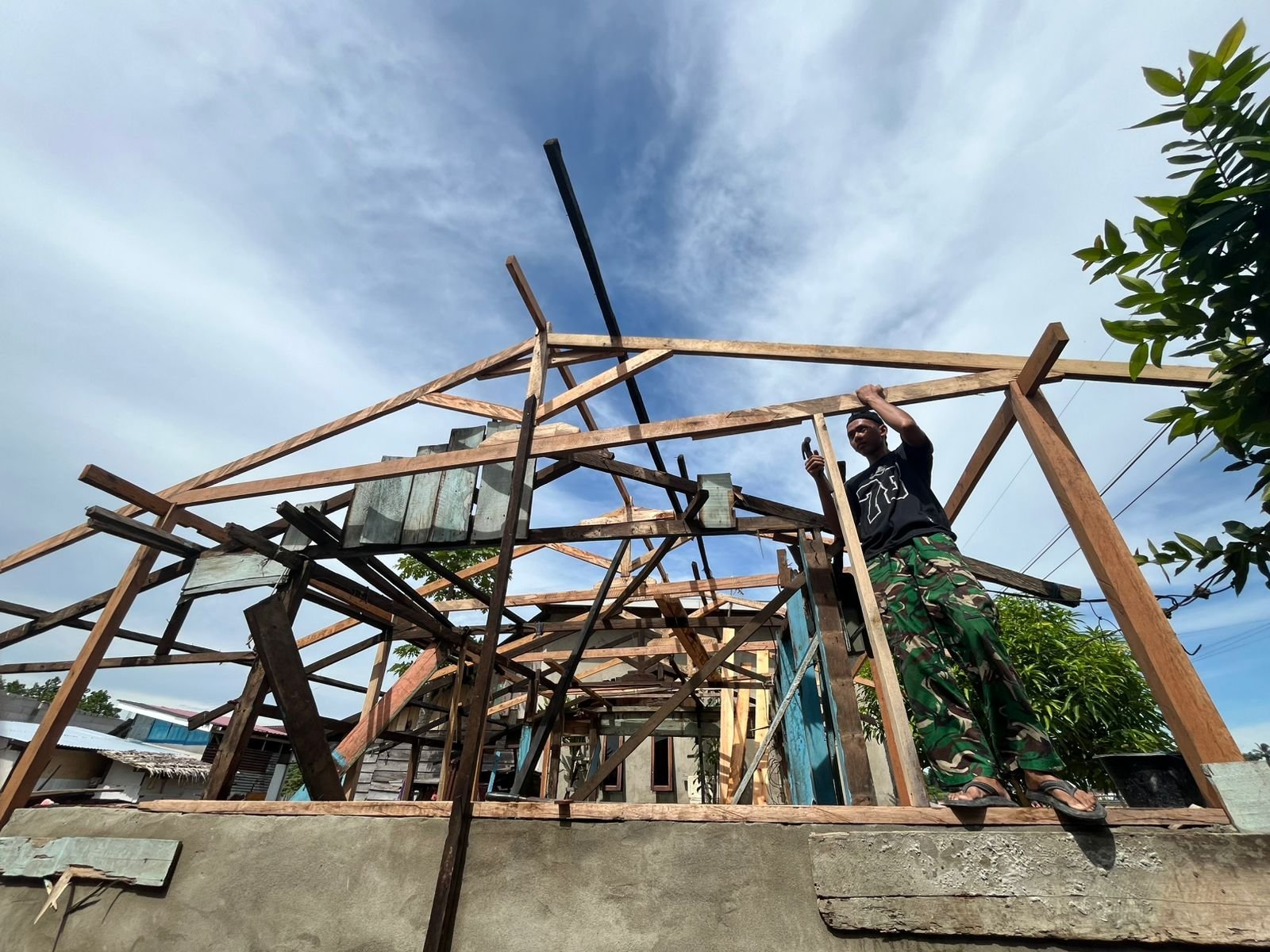 Warga bersama Satgas TMMD terlibat aktif dalam proses penurunan dan pengangkutan material ke titik-titik sasaran yang sulit dijangkau kendaraan, termasuk dengan menggunakan gerobak dorong dan pikulan manual.