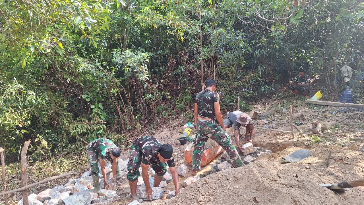 Pada Minggu (03/08/2025), anggota Satgas TMMD bersama warga mulai menyusun batu-batu sebagai bagian dari konstruksi dinding penahan jembatan. Pemasangan ini bertujuan untuk memperkuat sisi jembatan agar tidak mudah tergerus air dan tanah, terutama saat musim hujan. Batu yang digunakan merupakan jenis batu belah yang memiliki daya ikat tinggi saat dipadukan dengan adukan semen.