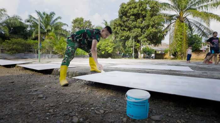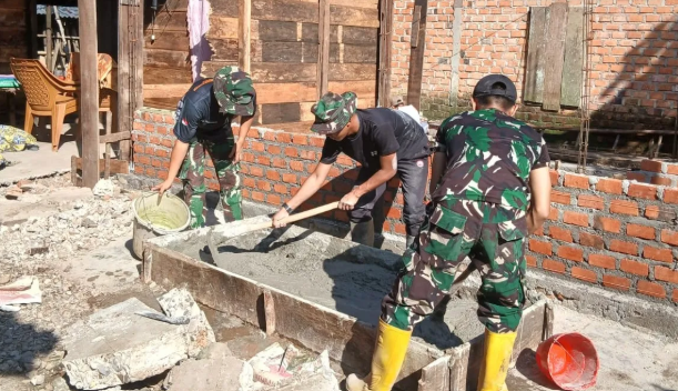 Di lokasi pembangunan, anggota Satgas TMMD berkolaborasi dengan masyarakat setempat dalam proses pemasangan batako secara gotong royong. Tahap ini merupakan komponen vital dalam menciptakan rumah yang lebih layak, kuat, dan nyaman bagi penerima bantuan tersebut.