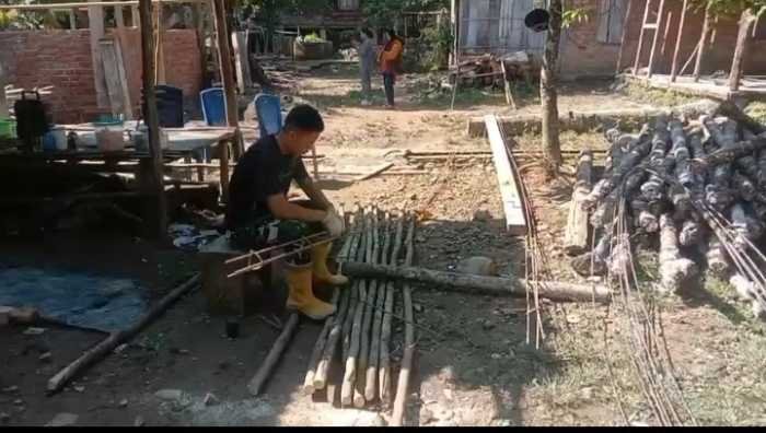 Anggota Satuan Tugas (Satgas) TNI Manunggal Membangun Desa (TMMD) ke-128 dari Kodim 0405 Lahat sedang melaksanakan perakitan batangan besi sebagai bagian dari upaya pembangunan infrastruktur di area yang menjadi target.