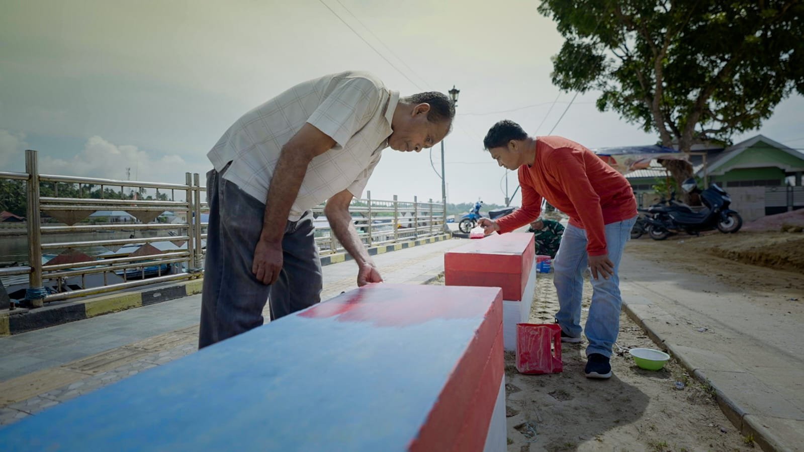 Dalam kegiatan tersebut, prajurit TNI bersama warga setempat bergotong royong mengecat pembatas jalan serta sejumlah fasilitas umum lainnya menggunakan warna merah putih.