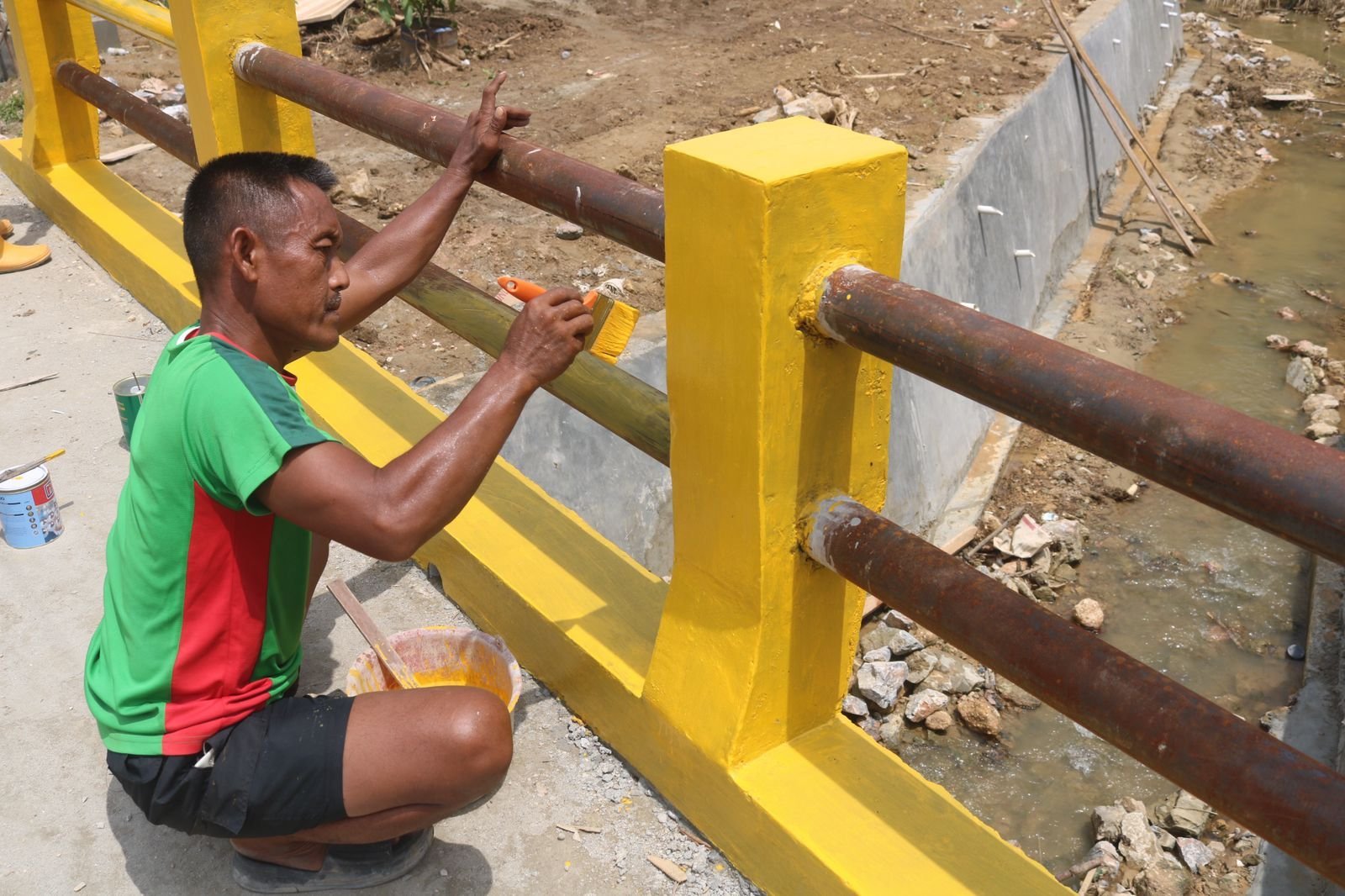 Pada tahap pekerjaan saat ini, sejumlah anggota Satgas terlihat melaksanakan pengecatan pagar jembatan yang menjadi salah satu akses penting bagi masyarakat setempat.
