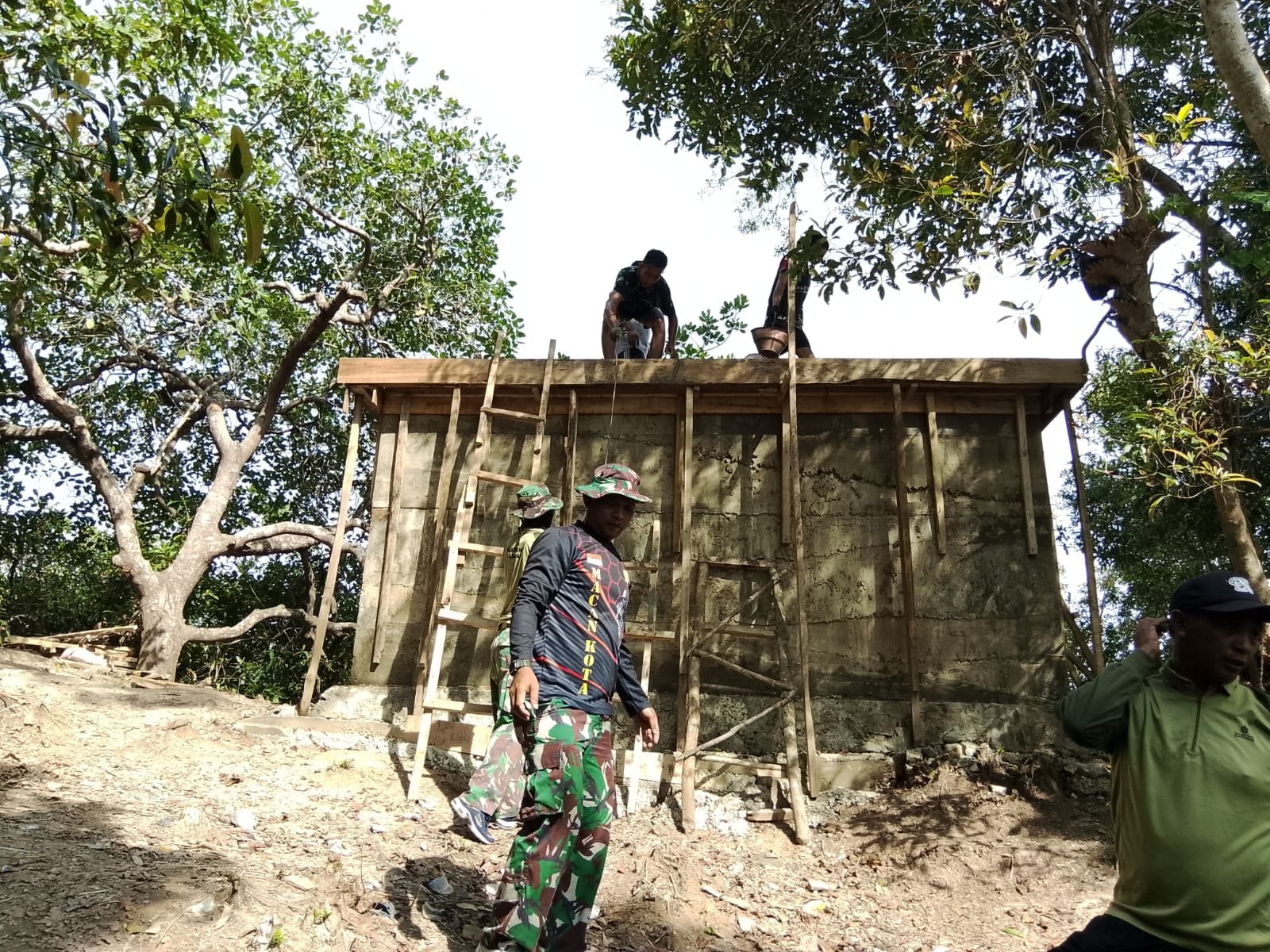 Pada tahap terbaru, prajurit TNI bersama warga setempat melaksanakan pengecoran bagian atap bak penampungan air bersih yang menjadi salah satu sasaran fisik program TMMD.