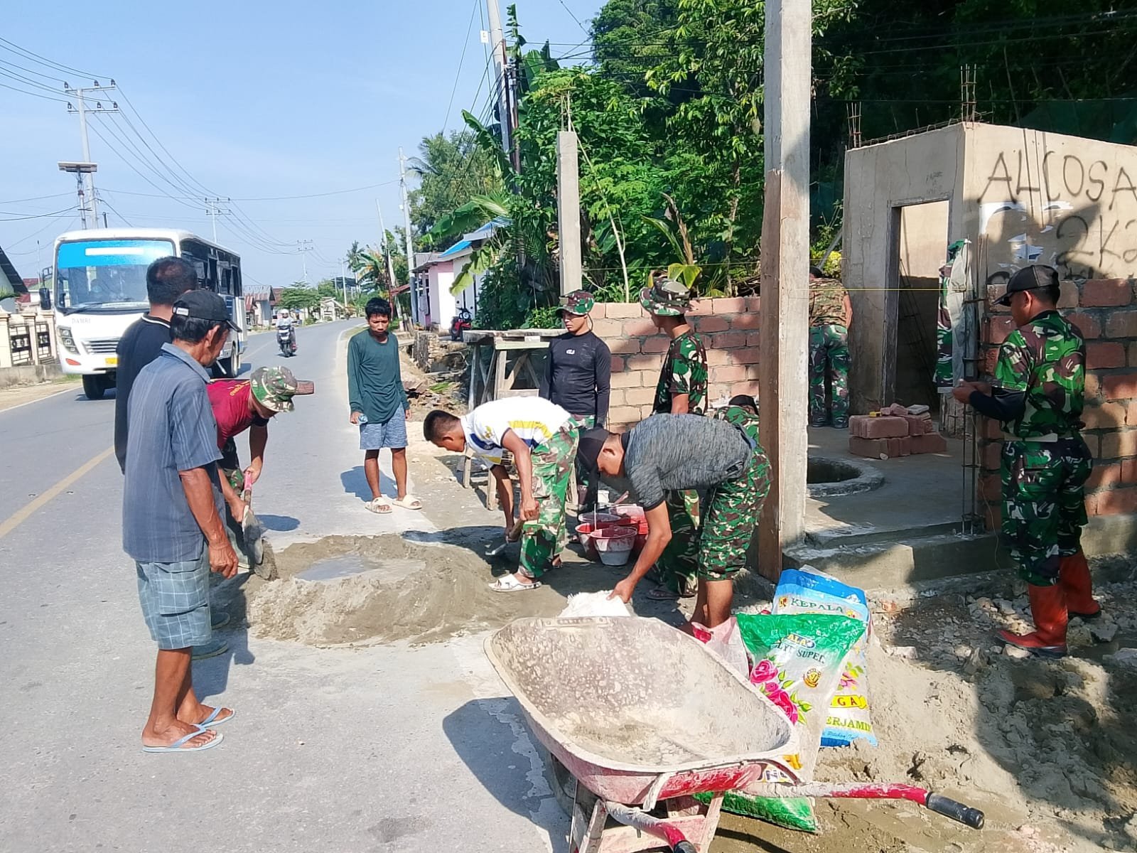 Di lokasi kegiatan, prajurit TNI dan warga terlihat bahu-membahu memasang dinding batako serta menyiapkan adukan semen untuk mempercepat proses pembangunan. Kekompakan tersebut mencerminkan semangat gotong royong yang menjadi ciri utama pelaksanaan TMMD.