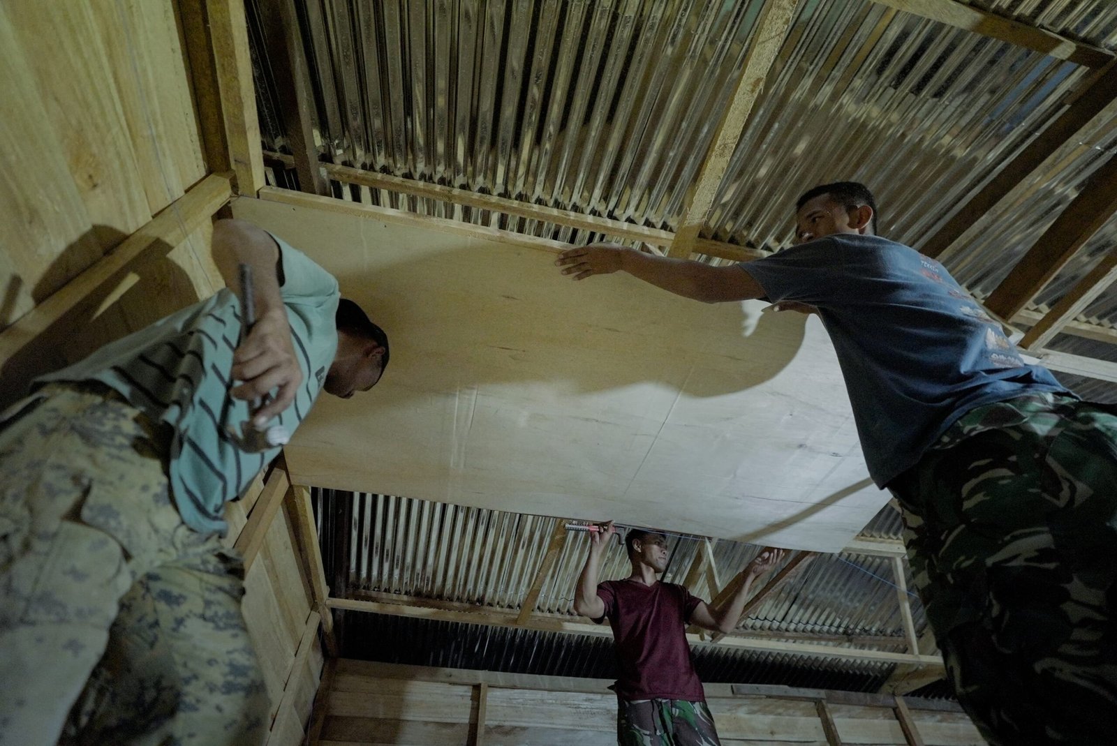 Meski hari telah gelap, para prajurit bersama warga setempat tetap melanjutkan pekerjaan pemasangan plafon rumah demi mengejar target penyelesaian pembangunan.