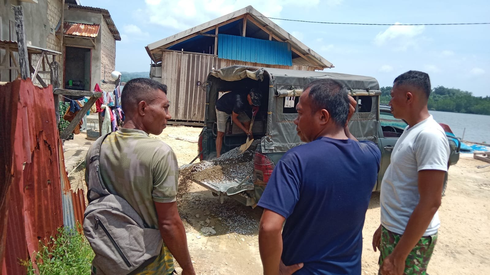 Untuk memastikan pasokan bahan bangunan tetap lancar menuju titik pembangunan, personel Satgas memaksimalkan penggunaan kendaraan dinas lapangan guna mengangkut berbagai material konstruksi.