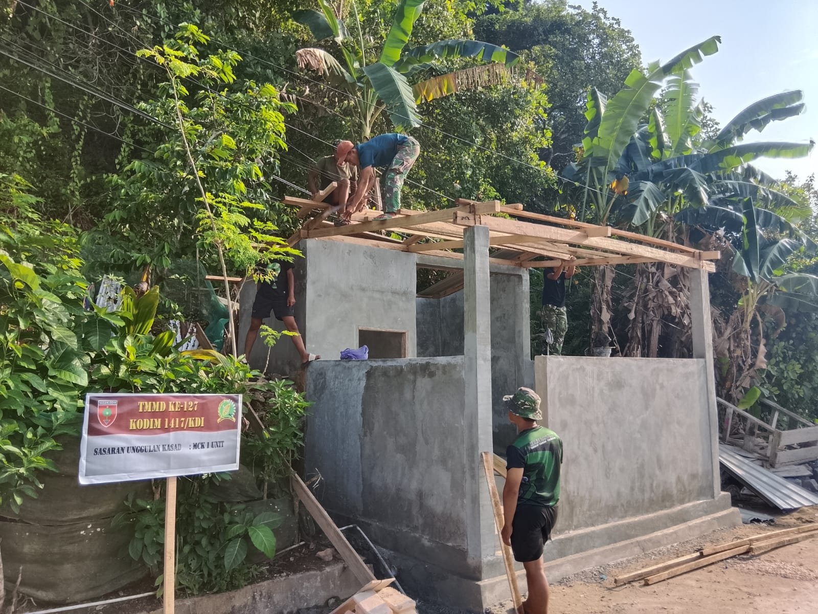 Kendari – Personel Satgas TMMD ke-127 dari Kodim 1417/Kendari bersama warga terus mempercepat pembangunan fasilitas sanitasi dengan melaksanakan pemasangan atap Mandi, Cuci, Kakus (MCK) di Kelurahan Sambuli, Kota Kendari, Minggu (8/3).