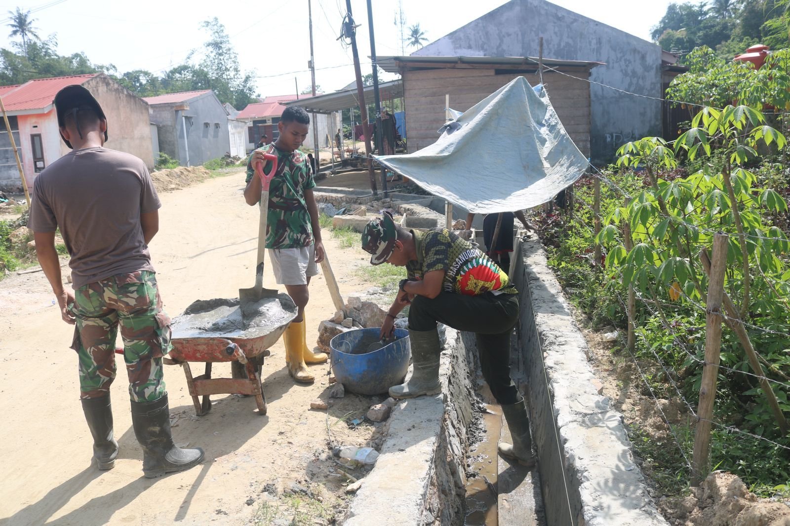 Pada tahap terbaru, sejumlah personel Satgas terlihat melakukan pekerjaan plasteran pada dinding saluran air atau drainase yang menjadi salah satu sasaran fisik program TMMD.