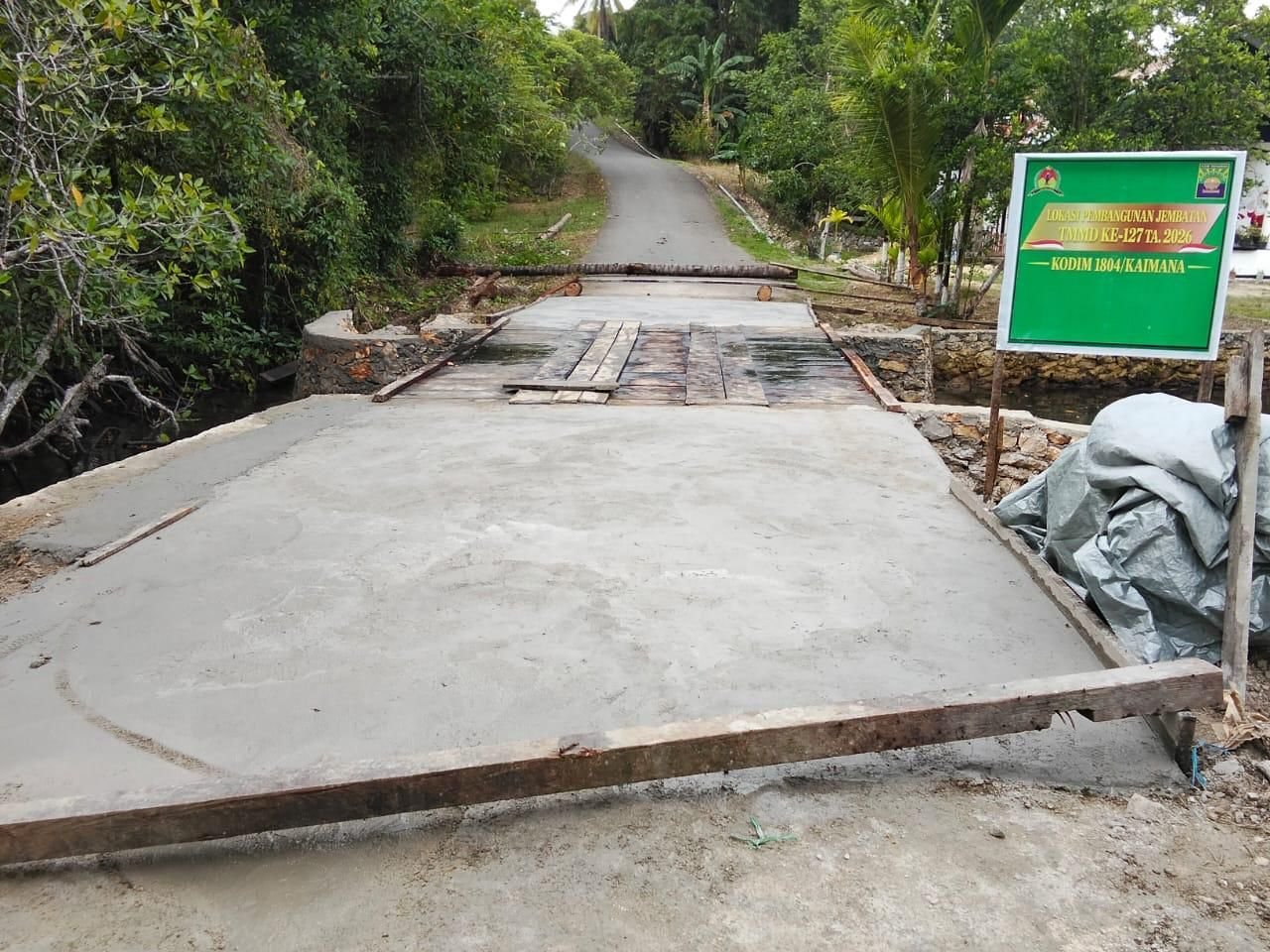 Kaimana – Personel Satgas TNI Manunggal Membangun Desa (TMMD) ke-127 dari Kodim 1804/Kaimana kembali melanjutkan pekerjaan pembangunan jembatan di Kampung Marsi, Distrik Kaimana, Kabupaten Kaimana, Sabtu (07/03/2026).
