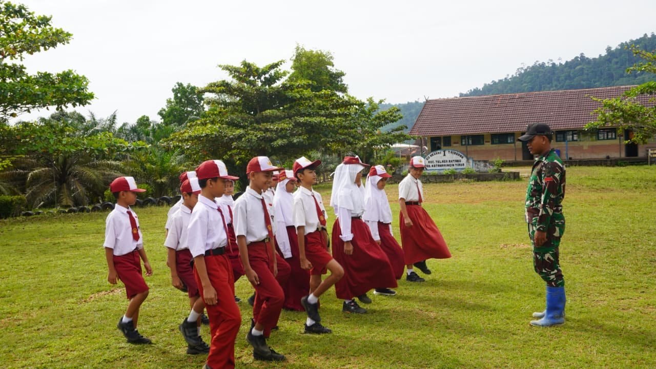 Kegiatan ini merupakan bagian dari sasaran non fisik TMMD yang bertujuan membentuk karakter dan kedisiplinan anak-anak sejak usia dini. Para siswa tampak antusias mengikuti arahan anggota Satgas saat mempraktikkan gerakan dasar baris-berbaris di halaman sekolah.