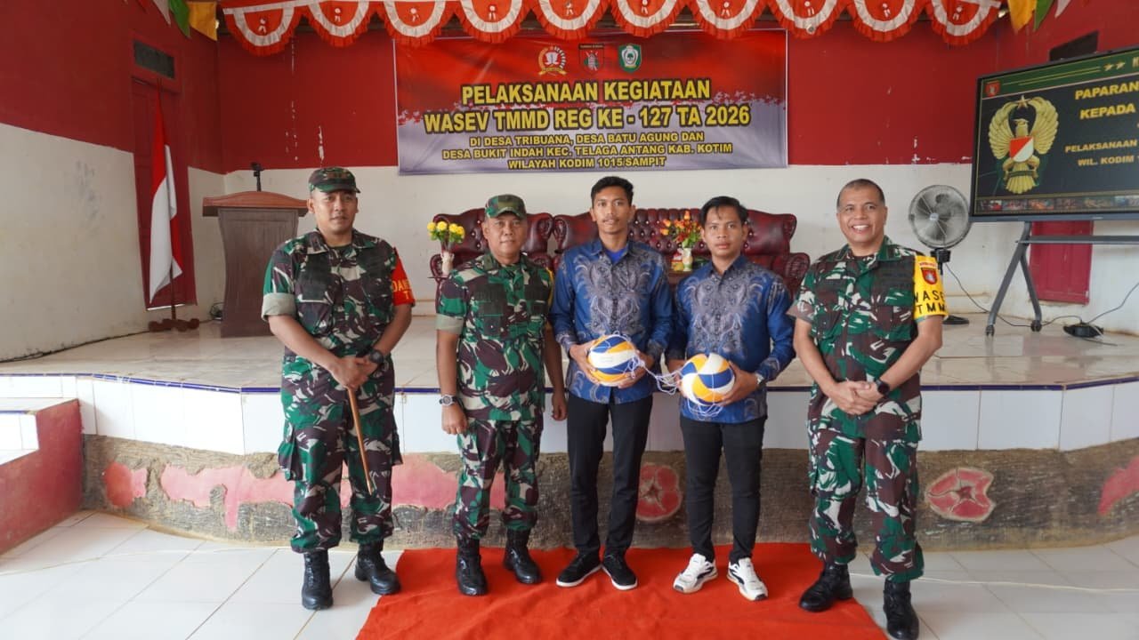 Kotawaringin Timur – Dalam rangkaian kunjungan kerja Pengawasan dan Evaluasi (Wasev) TMMD ke-127 Kodim 1015/Sampit, Tim Wasev Mabesad melaksanakan kegiatan non fisik berupa penyerahan bantuan alat olahraga kepada Karang Taruna di Balai Desa Tri Buana, Kecamatan Telaga Antang, Selasa (03/03/2026).