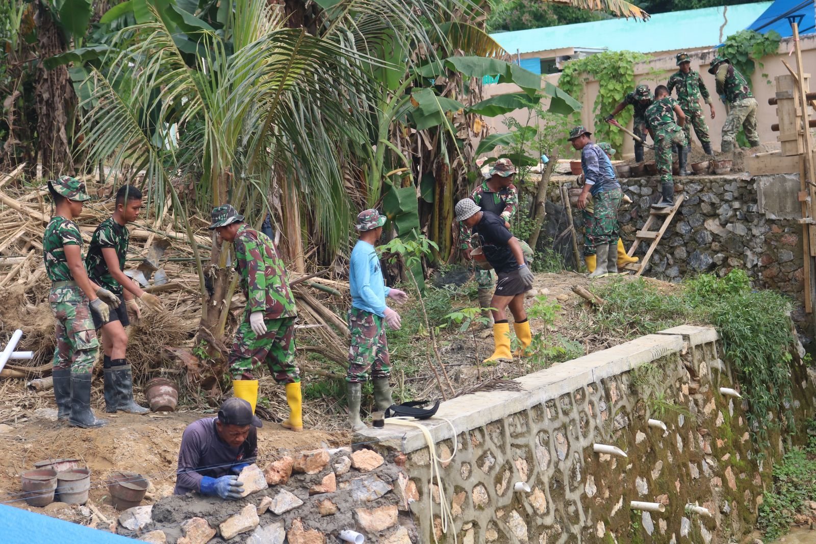 Personel TNI bersama warga setempat tampak kompak menyusun material demi menghadirkan struktur yang kokoh untuk mengantisipasi abrasi maupun potensi tanah longsor di area tersebut.